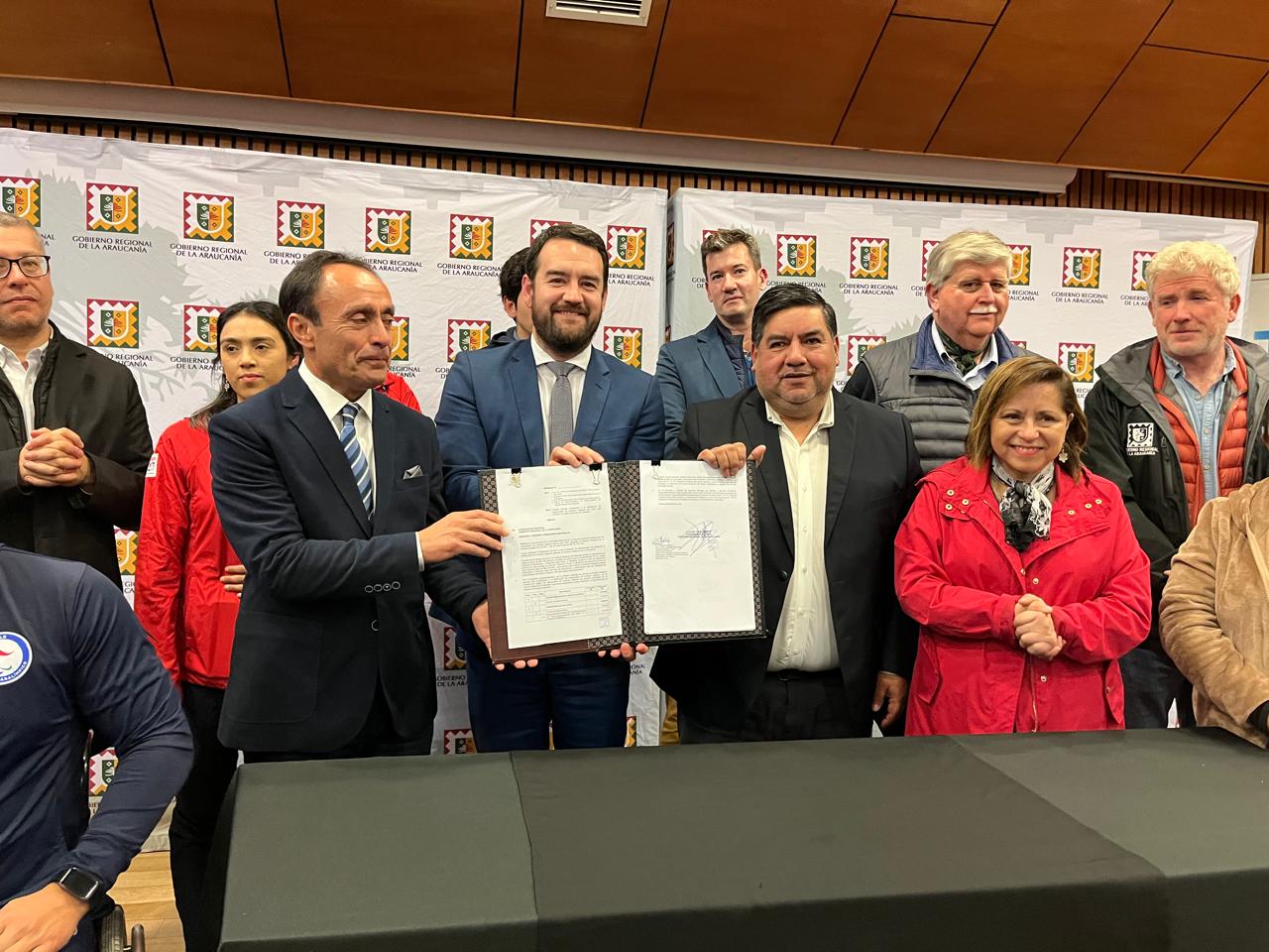 La máxima autoridad regional en compañía de los consejeros regionales, el ministro Jaime Pizarro y alcaldes de la región, firmaron este importante mensaje por $1.000 millones, que permitirá la realización de este evento que reunirá a más de 3.000 mil deportistas de todo el país en La Araucanía.