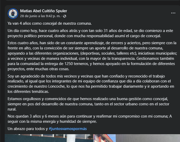 Loncoche, julio de 2025. A fines de junio, el concejal Matías Cuitiño Spuler compartió en redes sociales un extenso balance de su gestión en la comuna de Loncoche, con motivo de sus cuatro años en el cargo. Sin embargo, en medio de palabras de agradecimiento y orgullo por “gestionar solicitudes y apoyar organizaciones”, brilla por su ausencia cualquier referencia al rol legal que tiene como fiscalizador del uso de los recursos municipales.