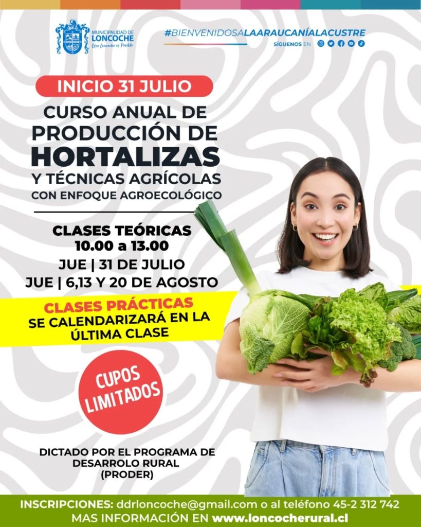 El Programa de Desarrollo Rural (PRODER) anunció la apertura de inscripciones para el curso “Producción de Hortalizas y Técnicas Agrícolas con Enfoque Agroecológico”, iniciativa gratuita que busca entregar herramientas prácticas y teóricas a pequeños agricultores, huerteros y personas interesadas en el cultivo sustentable.