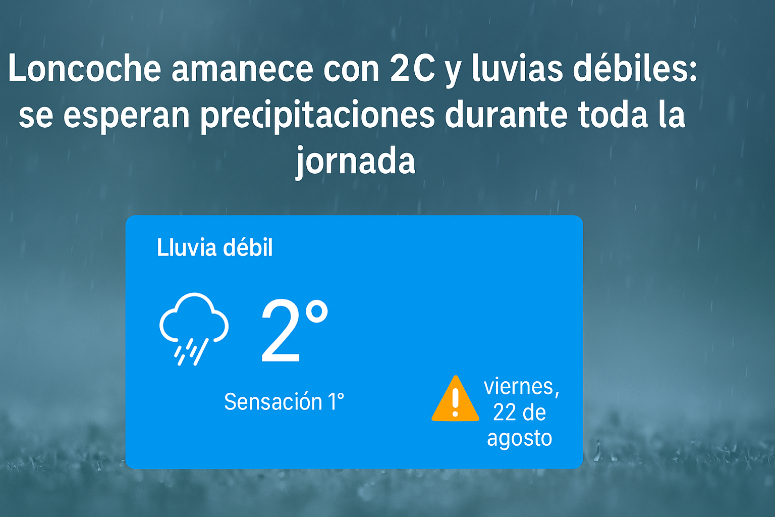 La comuna de Loncoche inició la mañana de este viernes 22 de agosto con 2°C de temperatura, sensación térmica de 1°C y presencia de lluvia débil, según el reporte de Meteored.